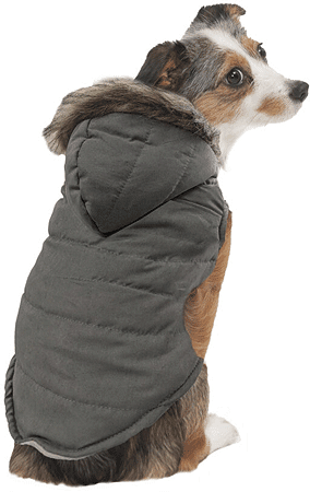 Velvety Puffer Coat Color: Gray Size: X-Small Velvety soft hand feel with a stylish faux fur trim hood. Soft and warm fleece on the flip side. 2 looks in 1! Leash hole. 100% Polyester. Machine wash cold separately gentle cycle with mild soap. Do not bleach. Do not dry clean. Hang to dry.
