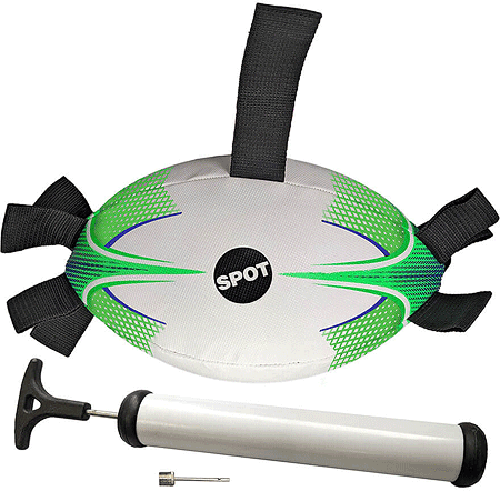 Football w/Ez-Tabs Pump Included Our Spot Football with EZ tabs is an interactive dog toy made for active lifestyles. Perfect for yards parks lakes pools and the beach. Durable nylon tabs all around the ball are easy for dogs to grab and tug. One larger tab for human hands to grab and toss. Pump...