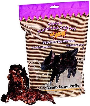 Jones Natural Chews Lamb Lung Puffs 8oz Made in the USA! This treat is a high protein treat and easily breaks up for training. Its light and tastly made of the best USA lamb lungs sliced and oven baked for great flavor and texture. Good low fat treat for all size dogs with no artificial...