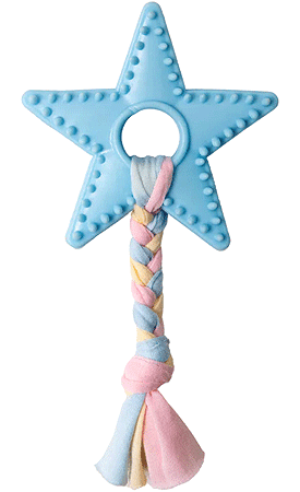 Eco Friendly Lil Star Chew Size: 7 - Blue These Eco friendly TPR toys are perfect for your little pup who loves to chew. These toys have a braided cotton rope attached for additional play. Designed to aid in dental health. Perfect for the lil chewer. Made from eco friendly materials.